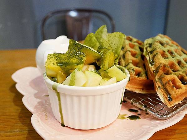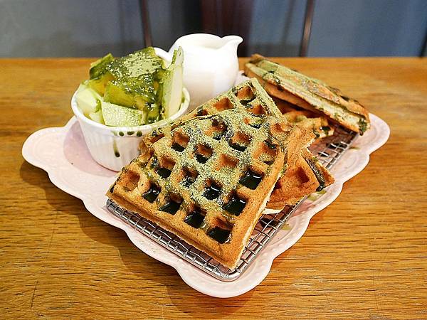 鬆餅上桌時,綠油油的抹茶醬已經淋上去,旁邊還會副一份抹茶水果冰淇淋和奶蓋