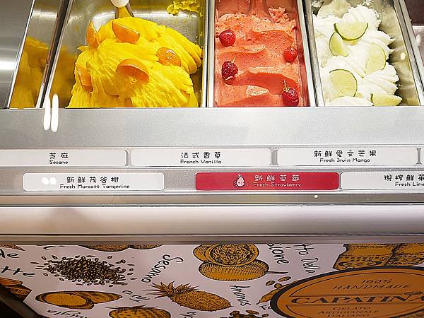 CAPATINA冰淇淋主打新鮮、自然、無添加,不同口味的冰品會放上相對應的水果當標記
