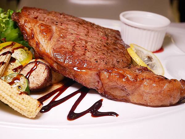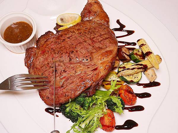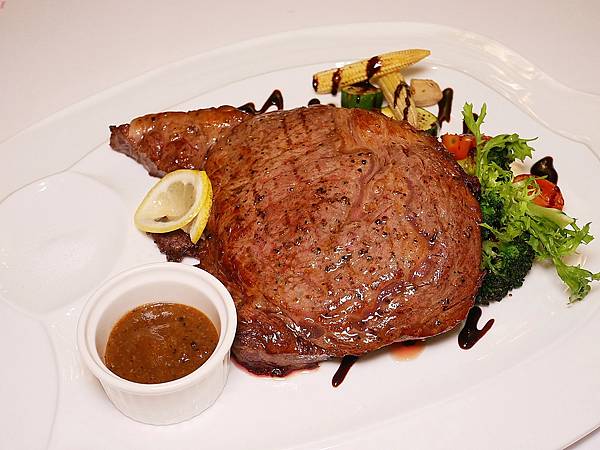 男友吃西餐非牛排不可,正好菲菲花園的牛排等級還滿高,直接點一塊吃爆,這塊16oz的牛排在size上以及厚度都非常吸睛,餐點一上桌讓人開動前忍不住多看兩眼,除了厚實牛排之外,旁邊還搭配淋了巴薩米克醋的烤蔬菜以及特製黑胡椒醬,相當豐盛