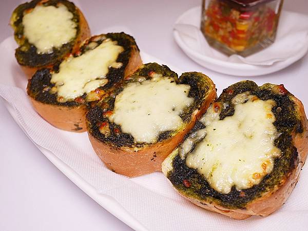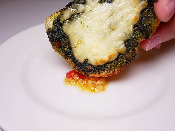 麵包塗滿青醬搭配一層焗烤就夠誘人,但真正美味的關鍵還是特製的秘密武器-橄欖辣油,青醬的香氣很濃郁夠味,焗烤不會太油膩,而且麵包本身也不乾硬,烤到酥香很好吃。