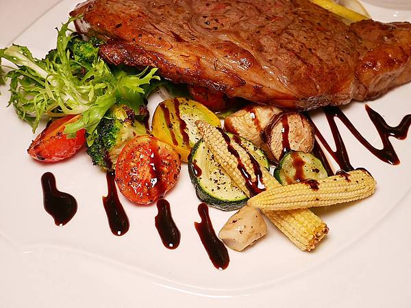 旁邊的蔬菜都相當新鮮,烤過之後水份都鎖在裡面,所以入口相當濕潤,沒有過多調味,只使用配香料以及巴薩米克醋提味,吃得出來保留食材原始風味還滿好吃,而且搭配旁邊超大塊牛排一起享用更均衡!