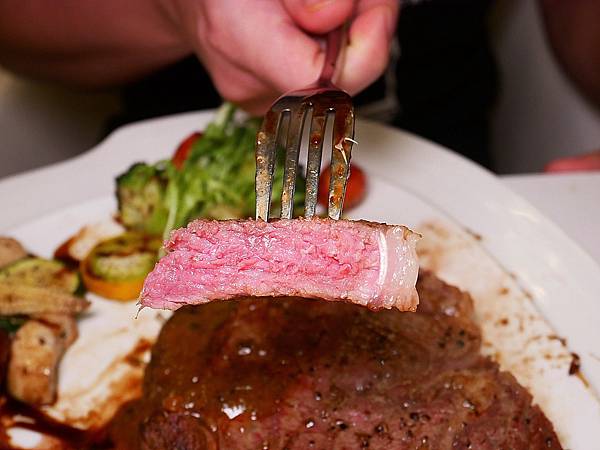 這塊肋眼牛排切開之後肉汁瘋狂流出來,我們點五分熟粉嫩的肉色真的超美,肋眼一側有條油筋,跟瘦肉的部分入口一起咀嚼,不僅增加口感而且也大大提升甜味跟濕潤度。
