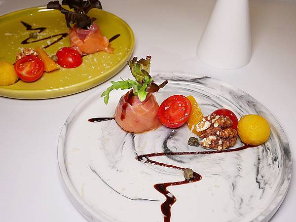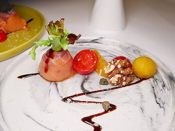 鮭魚花是使用北極地區的鮭魚,口感相當滑順細緻且肉質不乾澀,表現很棒,旁邊搭配的水果、堅果等等也都很新鮮,只是搭配的水果滿特別,甚至還有西瓜球,喜歡鮭魚的朋友這道很值得品嚐