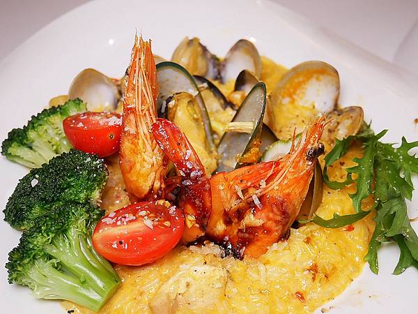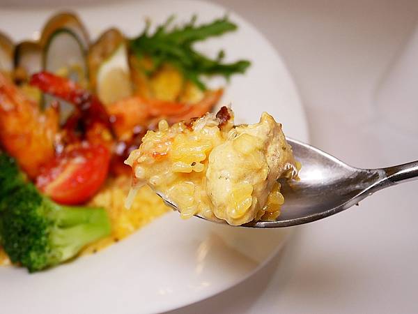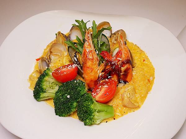 燉飯的部分使用海鮮高湯搭配鬱金香粉一起料理而成,算是滿清爽又夠味的醬汁,米飯也是保留米心的口感,我個人特別喜歡這種偏硬米的口感,很有咀嚼度