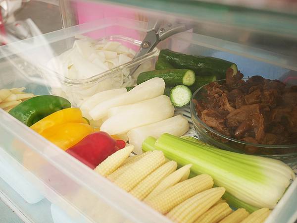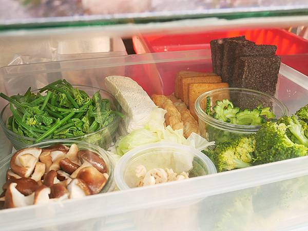 雖然攤位不大,但食材相當豐富,多種新鮮蔬菜以及百頁、米血等等可以挑選,透過櫥窗就能看出來蔬菜很新鮮,沒有乾乾癟癟或是變顏色,簡單調味最考驗的就是鮮度,高達18種配菜任君挑選,其中豆干、黑輪也歸類在蔬菜之內,蔬菜大致固定,但有些季節性的蔬菜會增減,這樣才可以吃到最當季的食材