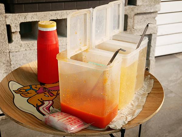 攤位後面有店家的秘密配方,分別是辣椒、蒜泥水、雞高湯,鹹水雞好吃的秘訣都在這邊,還會添加一些香油和胡椒提味還不錯
