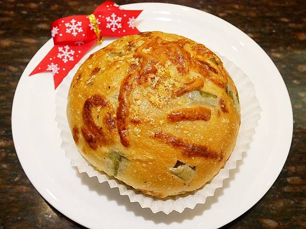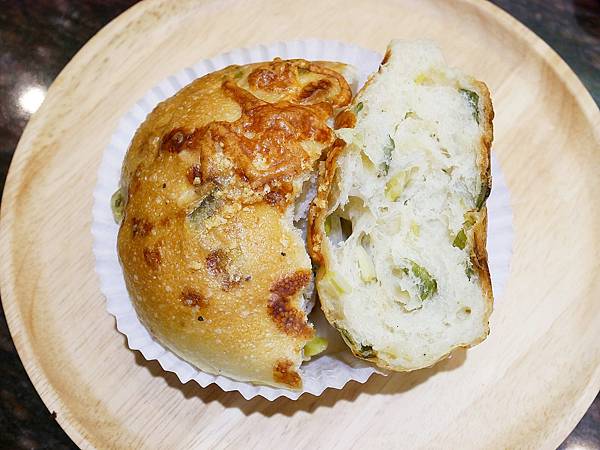 這款麵包是鹹味的,蓬鬆帶點嚼勁的的麵包包覆鹹香的青蔥一起入烤爐