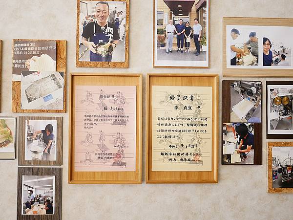 店內的牆上掛著老闆赴日學習製麵的紀錄以及結業證書!