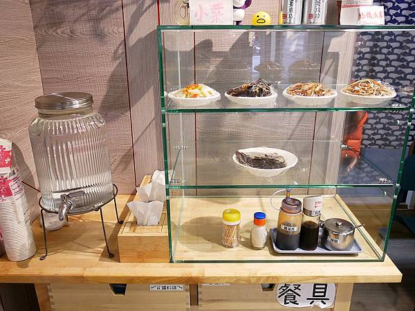 小菜都放在架上讓顧客自取,還有調味料跟開水可以取用!