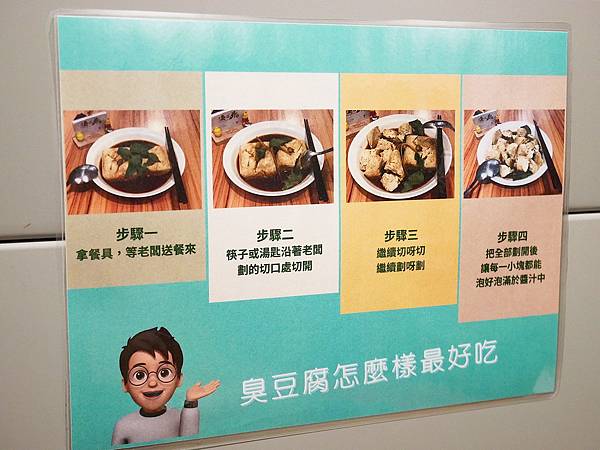 豆腐一份有兩塊,每塊都不小又厚實,牆上貼著一張臭豆腐的品嘗步驟別忘了照做