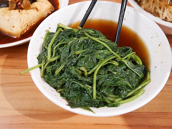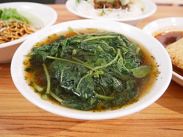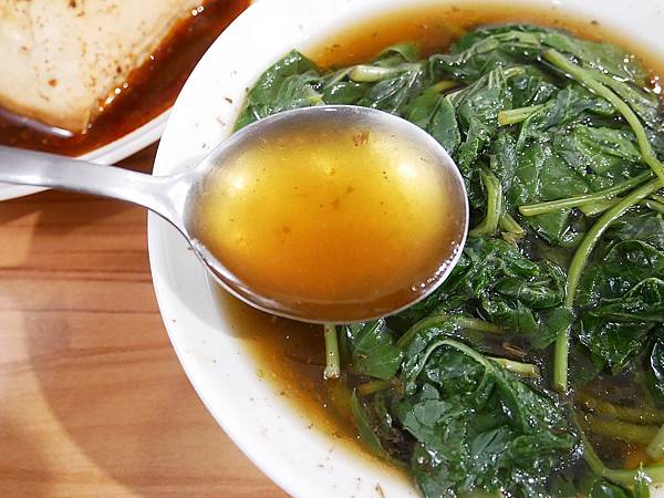 湯的味道是素肉燥結合地瓜葉的甜香味,蔬菜很新鮮,湯頭清爽不油膩,滿推薦點來配麵