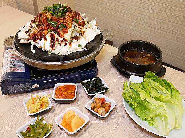 雖然這款是雙人套餐,但其實更推薦三個人一起享用份量較剛好,套餐會搭配六款小菜、兩碗飯、生菜還有大醬湯,其中比較特別的是白飯會分兩次上桌,第二次來的白飯是要跟剩下的醬汁、雞肉和蔬菜再加上泡菜、海苔和一些新鮮蔬菜去做成類似粥的吃法,喜歡吃鍋巴就放久一點,吃法很客製化。