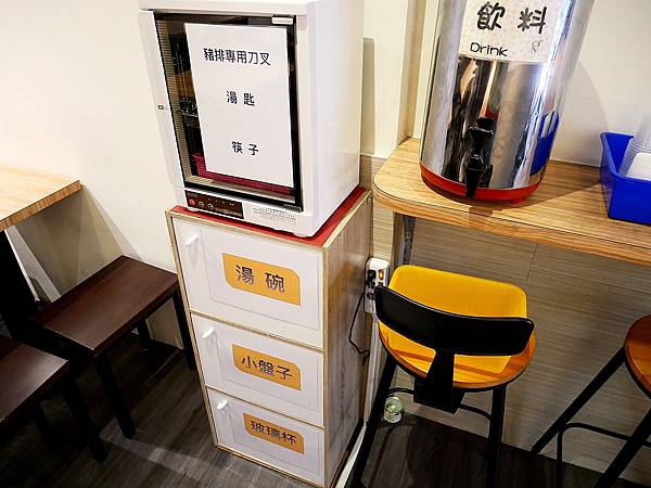 KIM DADDY有提供內用空間,雖然不是打通到一中街,但裡面的用餐空間也不算擁擠,是舒適的環境。餐具都放在入口處的櫃子裡面,店家有提供環保餐具這點對於不塑的我來說直接先加5分,旁邊也有老闆貼心準備的免費飲料可以享用。
