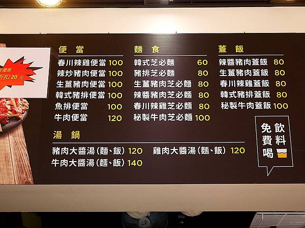 最受學生歡迎的是各種韓式便當,春川炒雞、辣炒豬肉都是便當的主菜,配菜也很韓,是各種韓式小菜。限定內用的鐵盤料理有提供雙人套餐,15公分左右的食材直接放到鐵盤上翻炒,還有店員桌邊服務超貼心,此外還搭配6款小菜以及一碗大醬湯,份量十足三個人一起吃都沒問題。芝必麵涼涼的吃很適合炎熱的夏天,搭配韓國的海苔絲一起享用真的很讚,一點也不輸給台式或日式涼麵。全部的料理都是韓國人親自傳授,老闆保證口味很道地!
