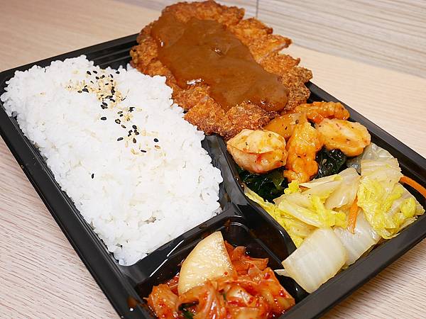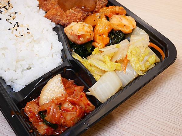 韓式豬排是老闆特別推薦,說是店內滿熱銷的品項之一。豬排的麵衣很酥脆,邊邊的部分稍微偏乾但中間的肉口感滿好咬不會柴,雖然不是厚實的豬排但味道不差,豬排本身就有調味,即使沒有上頭的特製韓式豬排醬也夠味。便當的菜量不算少,只是有些小菜口味比較重些,配著米飯一起吃比較剛好,但是味道都還不錯很下飯。