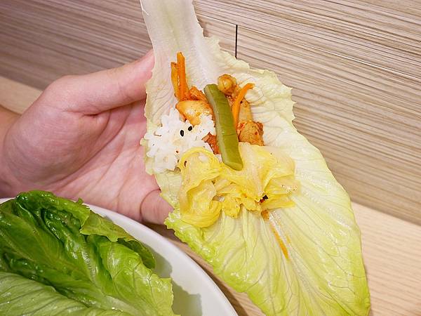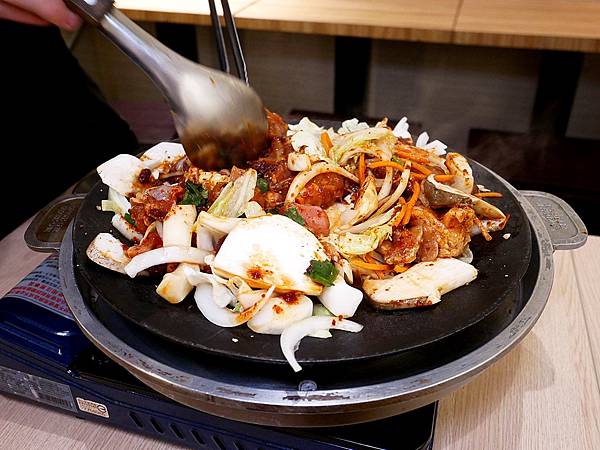 春川辣雞剛上桌的時候所有食材都是生的,點火之後等底部的高麗菜變軟出水才會由服務員桌邊服務拌炒,煮熟的春川辣雞滿重口味,鹹度對我ok但辣度還不低,單吃的時候直飆汗很過癮,雞肉非常嫩而且肉量不少,旁邊還有大量配菜。因為肉食的部分調味比較重,店家是建議顧客可以包在生菜裡面享用,這樣調味綜合起來會比較剛好,這樣的吃法相對清爽也更道地,生菜免費續可以盡情吃。服務員看顧客吃一半之後會再次來桌邊服務,替顧客在剩餘的春川辣雞內拌入米飯,之後的雜炊會比原本更重口味一些,但是不會死鹹,單吃或是包在生菜裡面的吃法都不錯,是很夠味的料理。