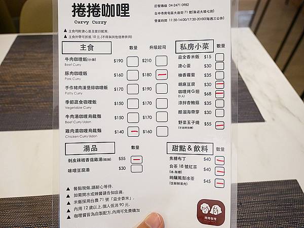 先附上菜單,捲捲咖哩如果外帶可以折抵$10,但續咖哩的優惠則是內用限定喔。店員在介紹菜單的時候特別提及,三種咖哩的口味皆是不同的,而私房菜的部分都是店家親自做的。