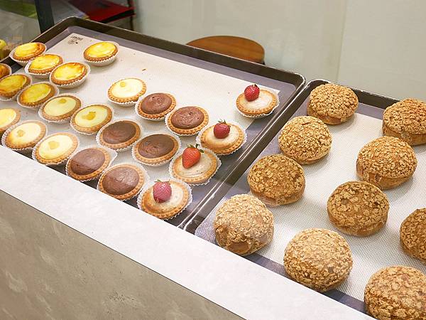 雖然隱身在巷子裡,但附近還滿好停車,店內空間不大,但是一踏進店內就是濃濃烘焙的香氣很誘人,現烤出爐的各種口味起司塔還有泡芙都擺在櫥窗前,服務員在拿取點心的時候也都會戴上口罩、手套讓人覺得很放心。