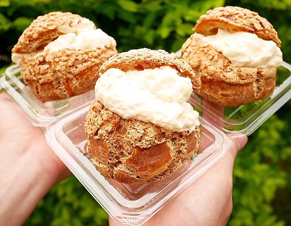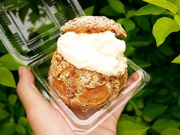 剛拿到的時候泡芙很脆,而且是脆而不硬的口感,建議立刻享用才能品嚐到泡芙最佳狀態,不然帶回家冰到隔天吃,泡芙微微在冰箱內受潮就沒那種爽脆感。中間的餡給得很大方,入口有點像生乳的香氣,但是質地比我吃過的生乳餡再稠一些,稱不上輕盈但也不會讓人覺得太厚重,奶味濃郁又不會太甜還算耐吃!