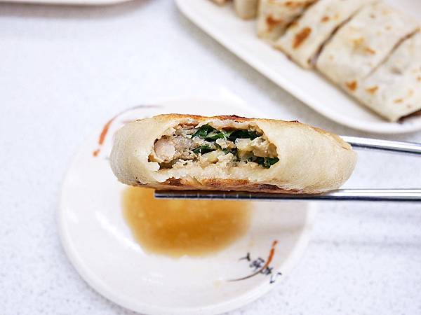 韭菜盒的外皮不會太厚,可是吃起來口感有點軟,我喜歡稍微酥脆感一點,裡面韭菜給不少,咬下也夠濕潤,內餡挺豐富飽滿,除了滿滿韭菜之外還有一點豆干跟冬粉,如果外皮再酥一點更棒。