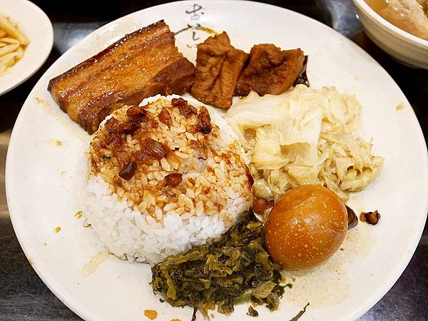 下港排骨酥湯的焢肉飯除了主菜之外還有四種配菜挺豐富,焢肉不算大塊但是口感還不錯,而且滷到入味又不會太乾柴,還滿值得點! 配菜的菜湯瀝得挺乾,所以盤底不會油膩膩很值得稱讚,米飯淋上肉燥入口增添風味我個人滿喜歡,這份便當表現不錯。