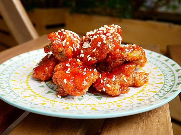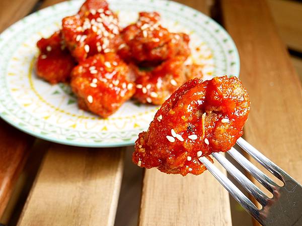 店家的韓式炸雞滿夠味,每塊炸雞都擦滿醬汁,鹹甜調味瞬間讓我想來一杯啤酒,不過這個調味我沒有很愛,反倒是男友比較喜歡。雞肉吃起來不乾柴,軟嫩不失嚼勁,只是邊邊的部分稍偏硬,綜合來說表現不差。