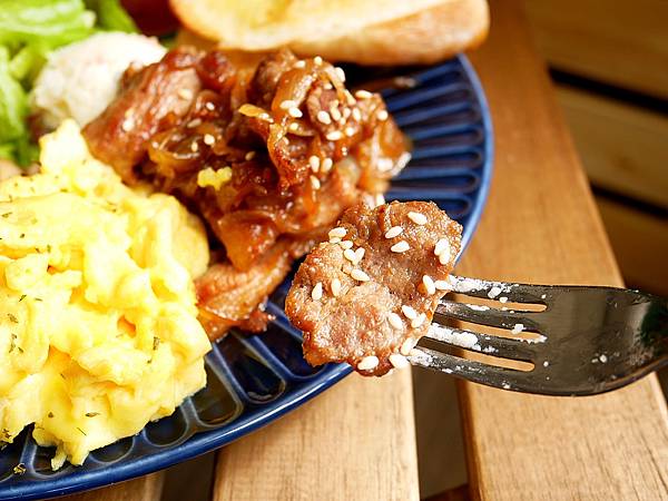 早午餐拼盤的食材滿豐富,包含嫩蛋、炒菇、生菜、馬鈴薯沙拉、主食、麵包等等,這盤的主角-照燒梅花豬調味鹹鹹甜甜超下飯,肉的口感滿紮實,比較不是軟嫩的肉塊,稍微有點咬勁很耐嚼,豬肉相當入味好適合夾麵包享用。嫩蛋挺厚實但不會太油膩,口感軟綿味道還不錯。軟法上頭抹了奶油,入口不會單調,外Q內軟而且不乾硬很好吃。炒菇QQ的而且調味還不錯、馬鈴薯沙拉內拌入不少蔬菜,但口感略突兀我沒有很愛、沙拉滿大份而且種類豐富,還有搭配水果很對我的味,沙拉醬味道還不錯,相當清爽耐吃很加分。