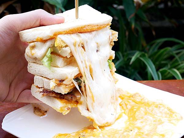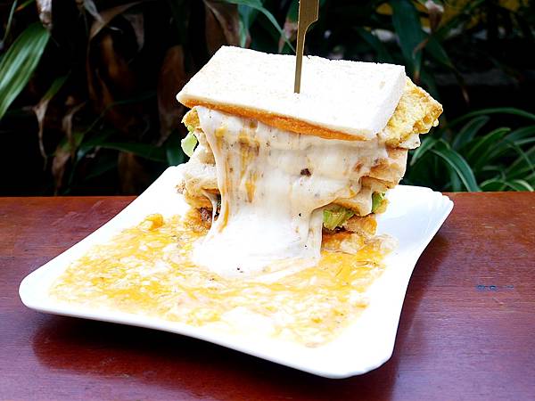 這款就是店家最熱銷的品項,幾乎大家第一次拜訪都是衝這份吐司而來,畢竟很少人能抵擋起司的誘惑! 雖然吐司浮誇了點,但中間夾入的料是真的不少,除了有一層地瓜泥、花生醬之外還有蛋、肉片以及大量生菜,搭配起來意外很清爽耐吃。