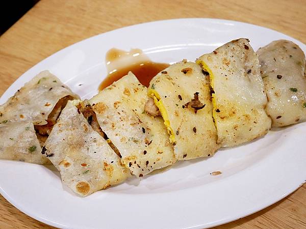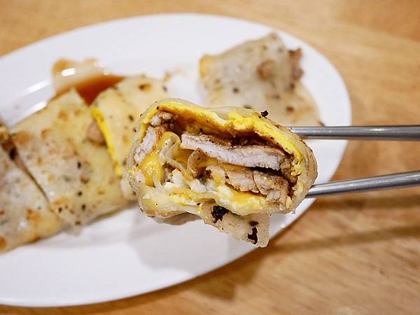 豆司苑的蛋餅皮是比較軟Q的,不夠酥很可惜,中間夾入厚厚一塊肉片,豬肉不會乾柴,醃漬的香氣跟起司還滿搭,店家的蛋餅如果餅皮再酥一點會更棒。