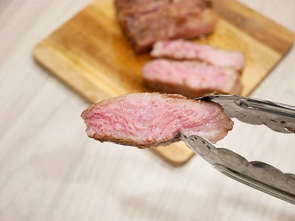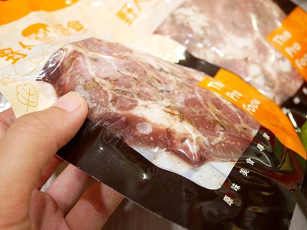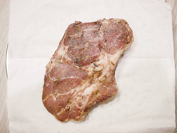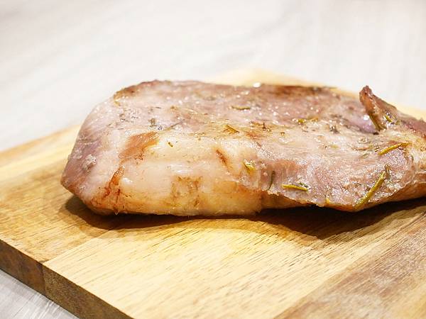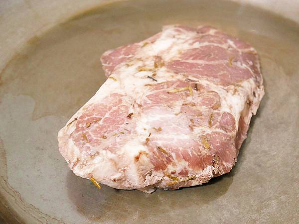野人舒食的豬肉是西班牙的伊比利黑豬,油脂含量相當豐富,但脂肪組成接近橄欖油,以不飽和脂肪酸組成,趁熱吃味道還不錯! 豬肉用百里香和迷迭香等等調味,口味不會太重,淡淡香料味我還滿喜歡。