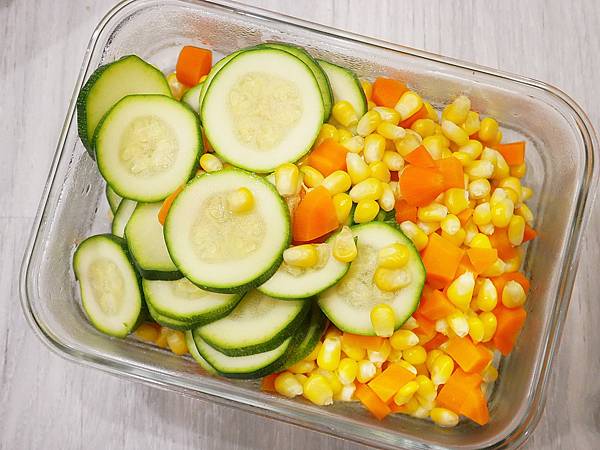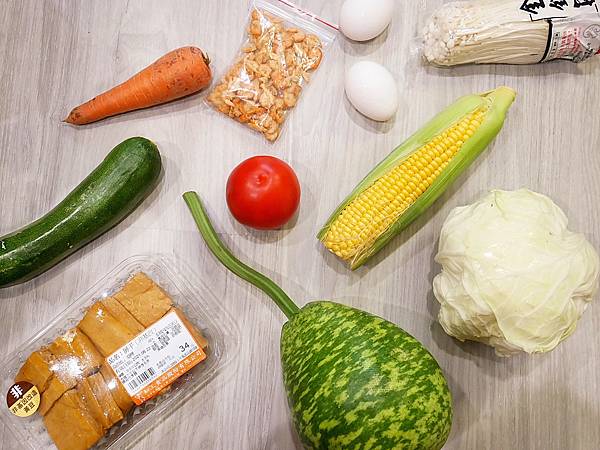 靜香先把食材全部處理起來,櫛瓜切片、紅蘿蔔切丁、玉米剝米、瓠瓜刨絲、豆干切片。