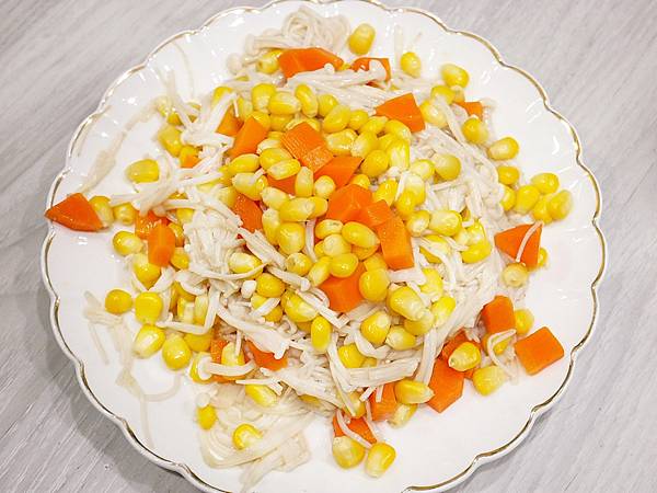 把金針菇切成小段,拌入玉米、紅蘿蔔之後再撒點胡椒拌勻就可以享用囉。