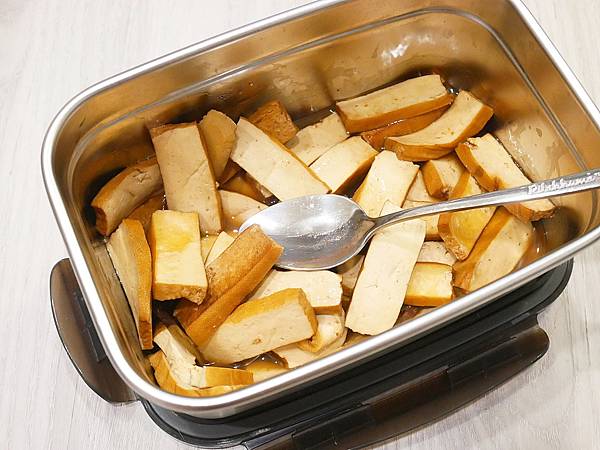 豆干切片之後,加點黑糖、蠔油跟甘草片,加點水稍微滷到入味,調味不會太重,淡淡醬香還有豆干的味道相當下飯。