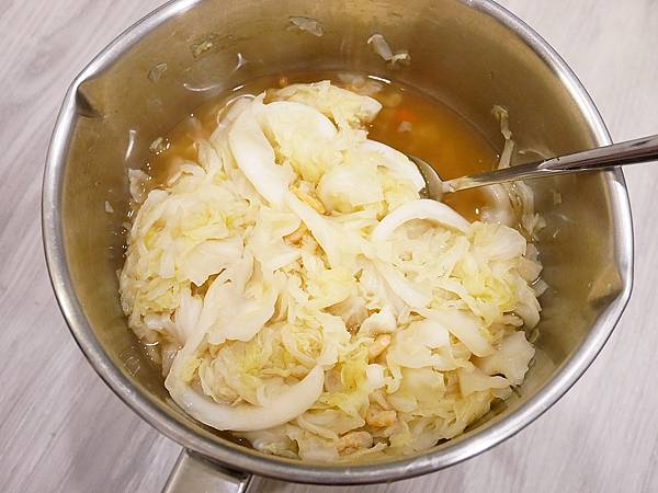 在鍋中倒50ml的水,放入蝦米和高麗菜再加上滷豆干的滷汁去悶煮,定期攪拌到高麗菜悶軟就可以開動囉!