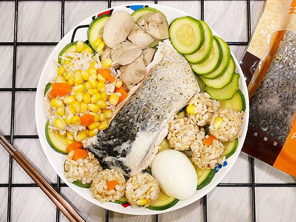 櫛瓜片平均鋪在盤子上,放上鮭魚排、配菜和米飯,搭配起來清爽又飽足超值得試試!