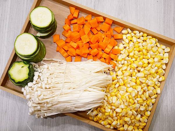 把玉米、紅蘿蔔、櫛瓜和金針菇入鍋燙熟,撈起來放在旁邊待用。