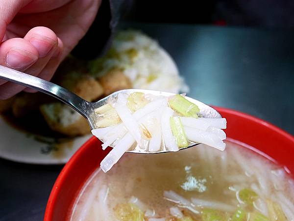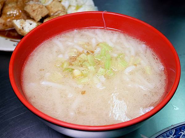 店家的米粉湯是北部的粗米粉,中和好多家米粉湯都是這種的,剛上桌時看起來偏油,但入口卻意外很清爽,湯有芹菜的香氣滿加分,粗米粉的口感表現還不錯,點一份再搭配臭豆腐就是很完美的晚餐。