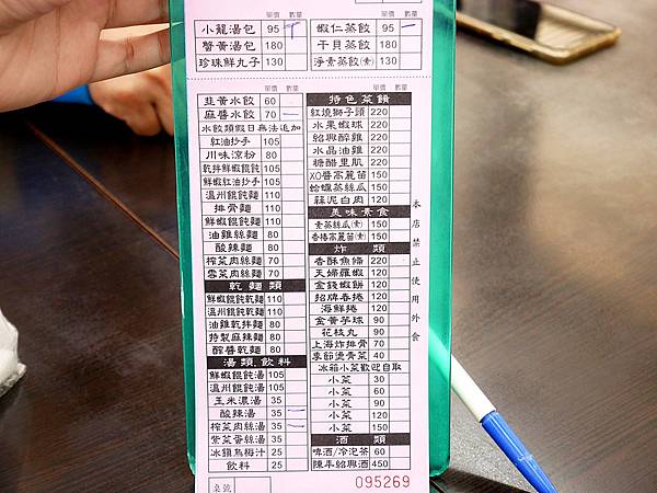 先附上菜單,店內販售的餐點品項非常豐富,除了湯包之外還有蒸餃、水餃,甚至是很多中式手路菜。菜單上的小菜價格不一,小菜都放在櫃台附近的冰箱內,種類豐富一字排開相當壯觀