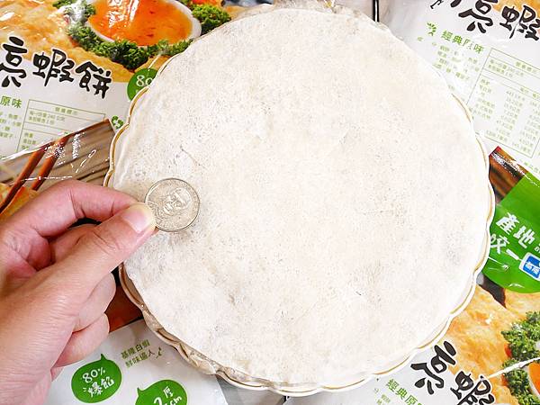 每包月亮蝦餅都是完整一大塊,怕各位不知道size,特別用10元銅板當比例尺做對比,蝦餅還滿大一片~ 從側面看有被驚嚇到,裡面的蝦肉整個炸出來,雖然是被蝦漿包裹,但還是能看到完整蝦子的身影。