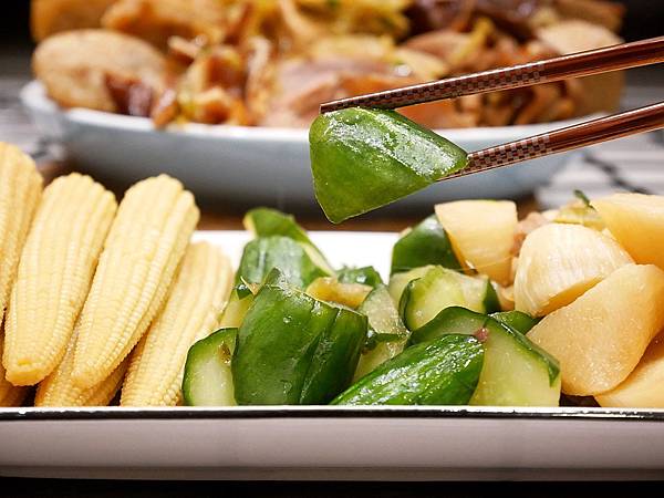 黃瓜用滾刀的切法,一口一塊剛剛好,黃瓜醃漬過,調味不重非常清爽,爽脆的口感相當多汁,讓人想一口接一口,用來搭配肉食超解膩!