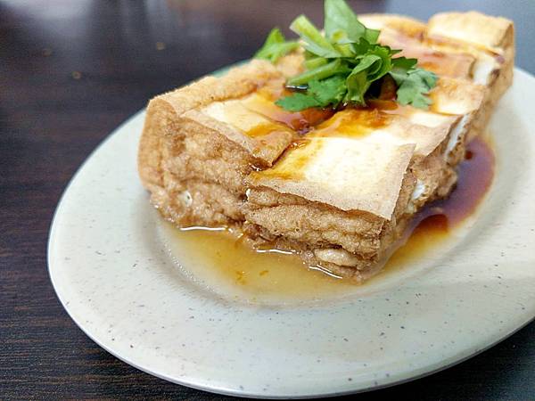 油豆腐共有12大塊,淋上醬汁再撒香菜很加分,豆腐的口感滿細,但是不夠入味相當可惜,不過單價不高又大份很下飯。