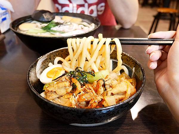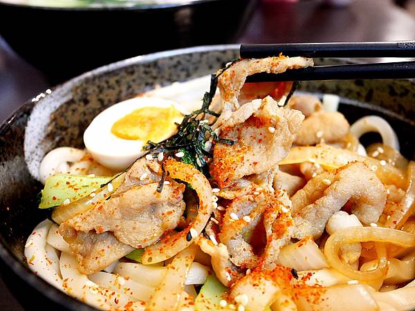 烏龍麵我個人還是喜歡吃乾的,至少目前吃過的炒烏龍麵幾乎沒踩過雷,鹹甜醬汁比湯的更有味道。豬肉片大塊又軟嫩Q彈相當吸驚,吸附醬汁很入味好吃,而且肉量不少是重點,除了肉片之外還有半顆溏心蛋和幾片青江菜,雖然配料沒有湯的多,不過上頭撒了七味粉微辣更夠味,麵條比湯的更Q彈有嚼勁,再來一碗我也可以輕鬆解決,這款完勝湯的。