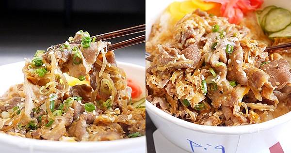 丼飯的肉量給得很大方,肉片吸附滿滿醬汁還有滑順的蛋搭配享用口感還不錯,其中拌入炒軟的洋蔥覽新鮮蔥花相當加分。肉片完全不乾柴,非常鹹香下飯,豬肉的味道比較明顯,對肉味敏感的朋友建議可以點牛會比較合胃口。丼飯內搭配三道漬物,大口挖飯在夾兩塊肉一起享用香氣十足~