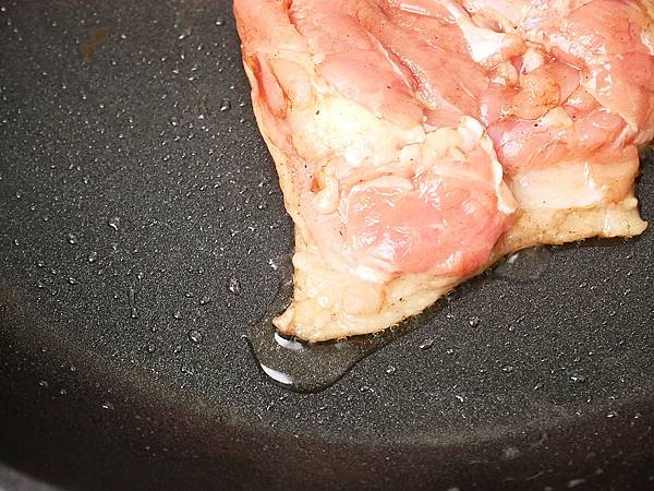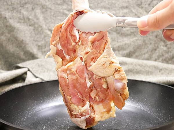 雞腿排可以透過平底鍋小火煎,或是利用氣炸鍋料理,靜香這次是用平底鍋煎,記得要先從雞皮那一面煎起,而且雞皮本身就是豐富的油脂,所以不用再額外加油才不會太油膩。