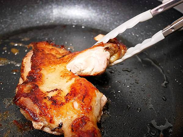 等雞皮那一面煎到呈現金黃色就可以翻面,煎雞排的時候可以蓋上鍋蓋,讓熱循環加快雞肉熟的速度,等兩面都煎到上色後,用料裡剪刀確認中間比較厚的部位也熟了之後就完成囉。
