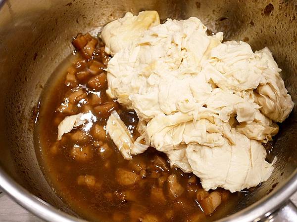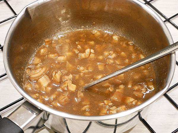 加熱的時候火不要開太大,不然皮很容易沾黏在鍋底喔,用小火搭配邊攪拌,其實煮滿快的,記得兩面都要均勻加熱到喔,鍋子可以選大一點比較好翻面,我的這個鍋子太剛好有點麻煩。