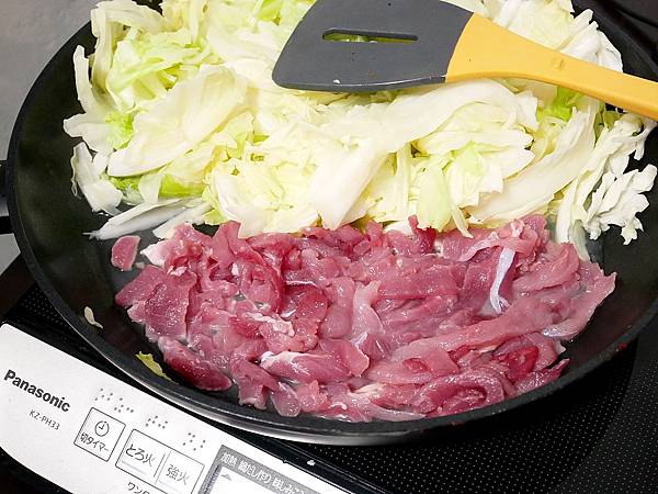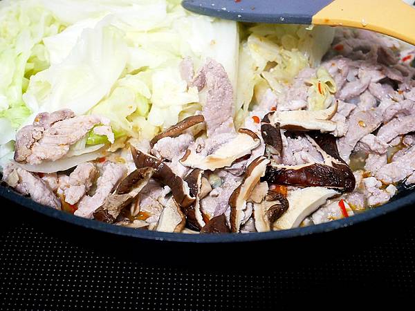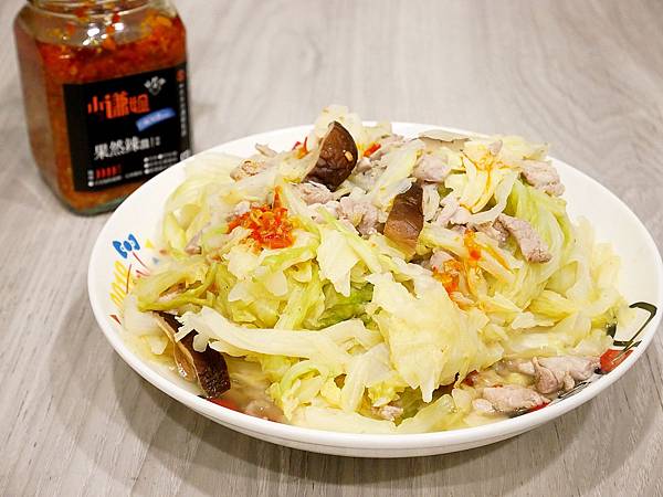 靜香用半顆高麗菜搭配一大盤肉絲和香菇,先把高麗菜炒到半軟,空出一塊放入肉絲炒熟,接著加入一勺果然辣醬拌均勻,最後放入香菇絲再把所有食材拌炒一次就能起鍋囉~