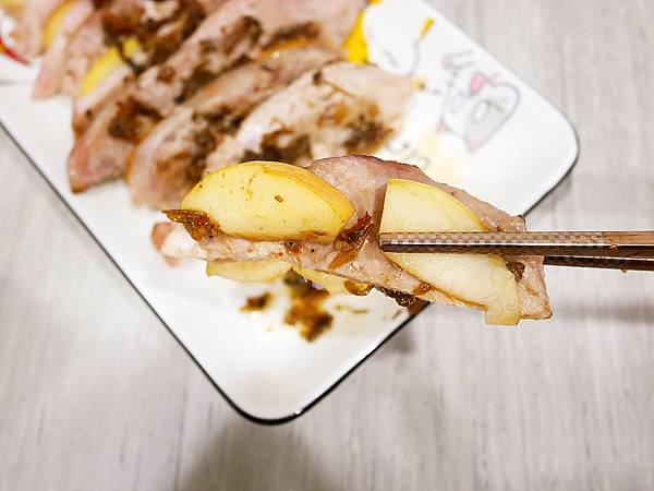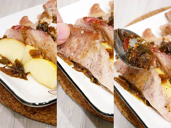 靜香還蠻喜歡用水果入菜,其中蘋果就是一個很棒的選擇,不管有沒有加熱過都好吃,到豬肉攤請老闆幫你切肉片,兩面煎熟之後灑點黑胡椒就很香,把蘋果切薄片之後,跟肉片層層疊疊,最後淋上美感菜肉醬以及果然辣醬就非常好吃,蘋果的甜跟梅干菜的甘醇以及肉香氣完美結合,推薦大家一定要試試~