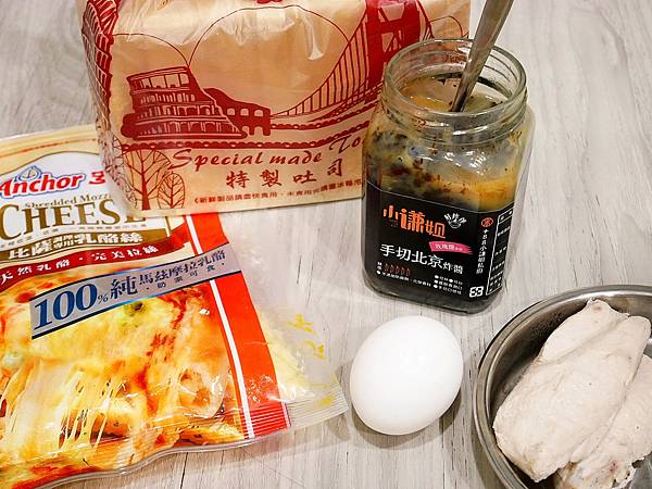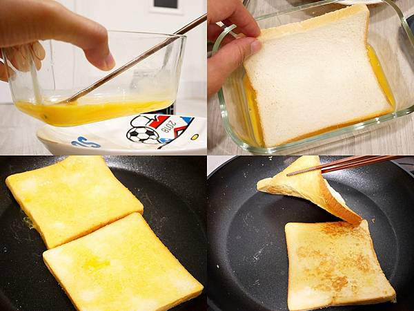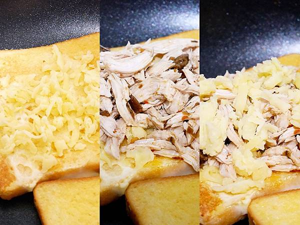 打一顆蛋,將兩片吐司的兩面均勻裹上蛋液,煎到呈現金黃色就可以舖上乳酪絲,接著擺上雞肉絲後再灑一些乳酪絲,利用吐司的熱度讓乳酪絲融化其中,能跟雞肉絲均勻混合。