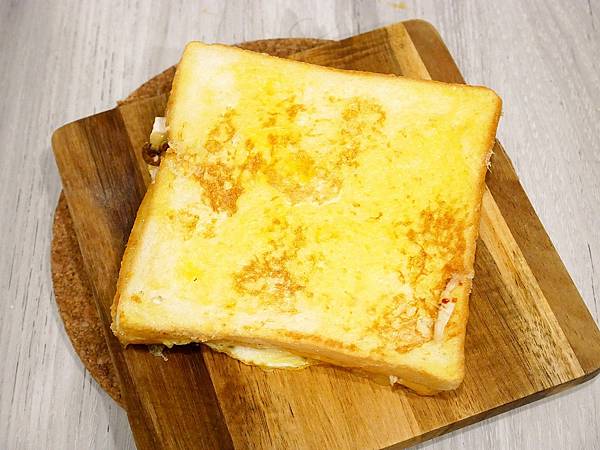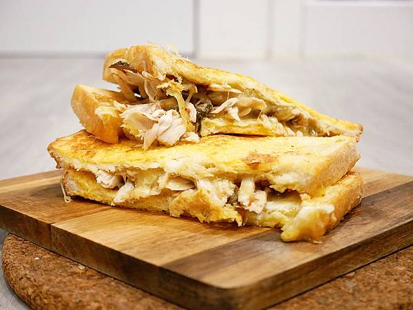 吐司趁熱切開後會牽絲,鹹香的雞肉跟乳酪挺合拍,美味的法式吐司就完成啦~